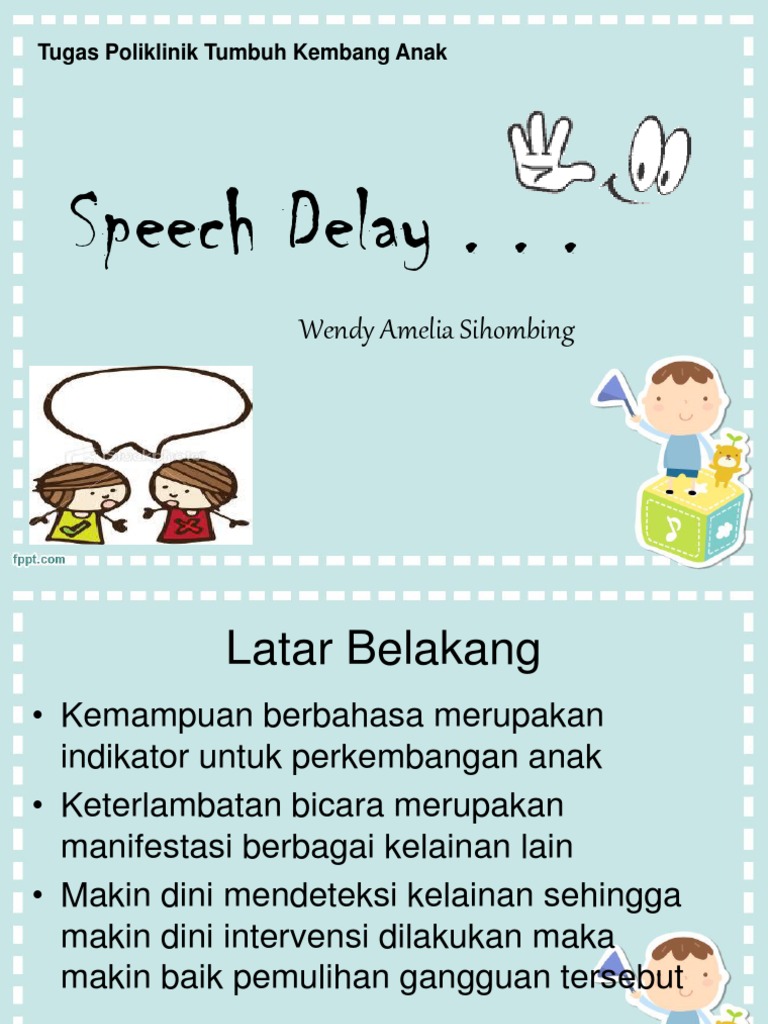 Cara ini juga dapat melatih anak mengucapkan kata dengan benar. Beberapa ada yang percaya mitos bahwa perkembangan berbicara anak bisa saja terlambat karena perkembangan di bidang lain lebih cepat. Speech Delay Pada Anak.